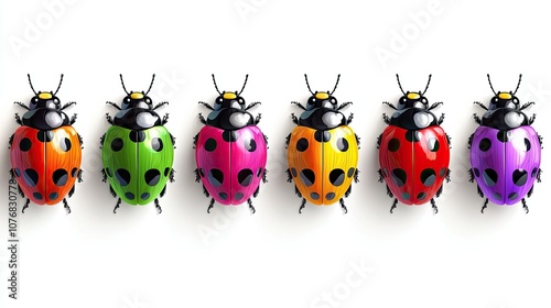 © Vodkaz, Fototapeta premium Colorful ladybugs lined up, showcasing vibrant hues and unique patterns, isolated on white background