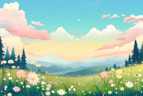 Fototapeta premium Colorful Landscape with Blooming Wildflowers and Rolling Hills
