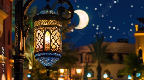 © suzita, Obraz premium Colorful Lantern with Stars and Moon in Night Sky