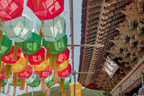 Naklejka premium Colorful lanterns and traditional architecture at the Beomeosa Buddhist...