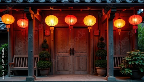 © ຈໍາປາ ຈໍາປາ, Obraz premium Colorful lanterns hang from wooden beams above the door, wooden, seasonal, lighting