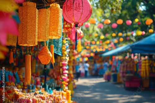 © nurionstudio, Naklejka premium Colorful lanterns hanging at an outdoor market.