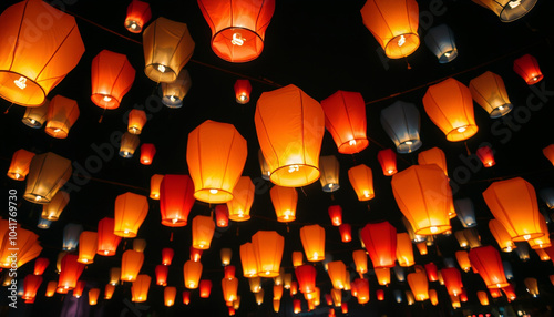 © RungsakThekop, Naklejka premium Colorful lanterns illuminate night sky, creating festive atmosphere