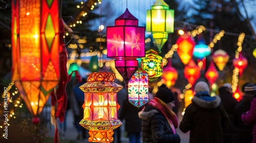 Naklejka premium Colorful Lanterns Illuminating a Festive Evening Stroll Through a Winter...