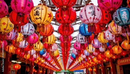 Naklejka premium Colorful Lanterns Illuminating a Festive Street in a Traditional Cultural...