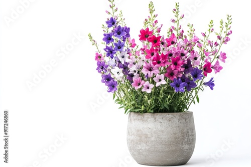 © Barra Fire, Fototapeta premium Colorful larkspur flowers in the pot isolated on a white background