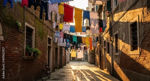 © MDTOUFICKAHAMAD, Fototapeta premium Colorful laundry hanging in a narrow venetian alleyway at sunset