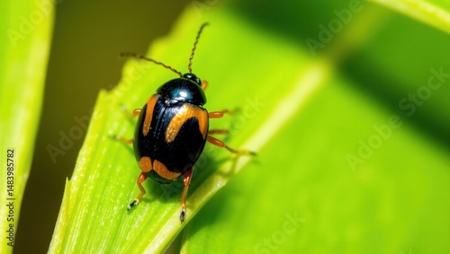 Fototapeta premium Colorful Leaf Beetle on Green Blade of Grass Close-Up