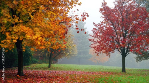 Naklejka premium Colorful Leaves and Trees in Autumn Season - Flora and Fog with Copy Space