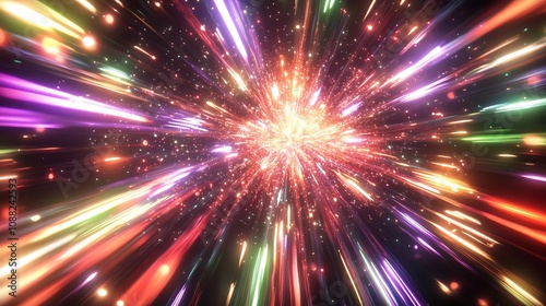 © Generative Media Lab, Naklejka premium Colorful light streaks radiating from central explosion in dark space.