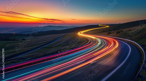 © Terablete, Naklejka premium colorful light trails on a winding highway at sunset
