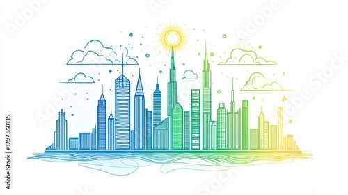 Obraz premium Colorful line art cityscape, urban skyline, sunrise, abstract illustration,...