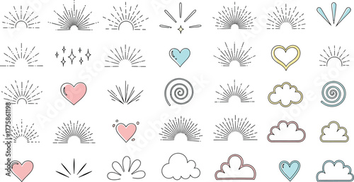 Fototapeta premium Colorful Line Art Icons Set with Hearts, Clouds, Spirals and Sun Rays Isolated