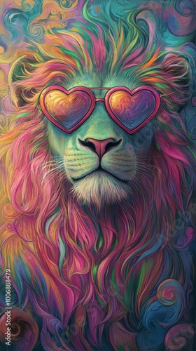 Fototapeta premium Colorful lion portrait with heart-shaped sunglasses, digital art. Artistic and creative expression concept