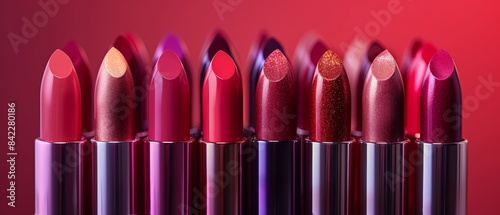 © Nicky, Obraz premium Colorful lipstick with different glosses on a red background.