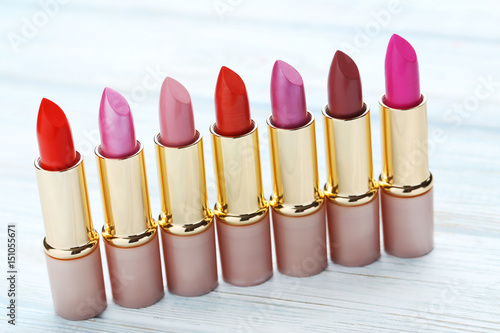 © 5second, Obraz premium Colorful lipsticks on blue wooden table