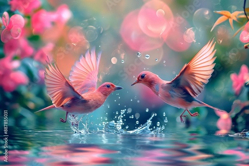 © grey, Obraz premium Colorful little birds playing water at a lake