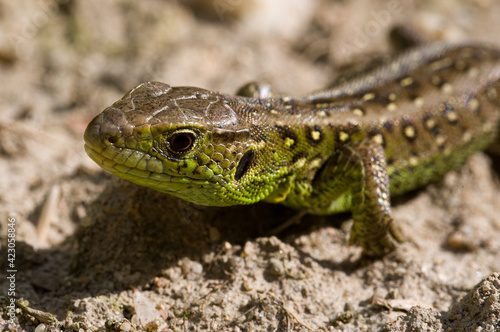 © Heiner Weiss, Naklejka premium colorful lizard on a stone way