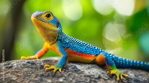 © Kanika Graphic, Obraz premium Colorful Lizard on Rock with Vibrant Blue and Orange Scales