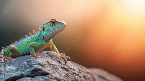 Fototapeta premium Colorful lizard perched on a rock during sunset, showcasing vibrant colors in...