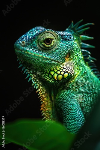 © Thanyaporn, Obraz premium Colorful Lizard with Detailed Texture Posing on Leaf Against Dark Background
