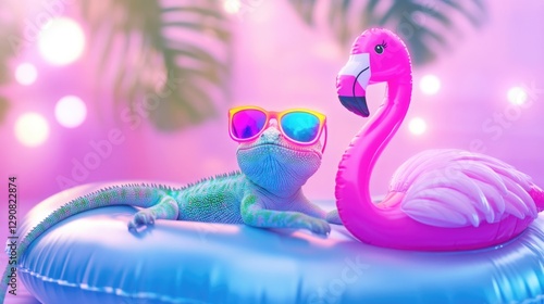 Fototapeta premium Colorful lizard with sunglasses relaxing on inflatable with pink flamingo in tropical setting