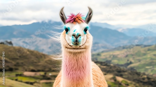 Obraz premium Colorful llama with traditional decorations standing in lush mountainous...