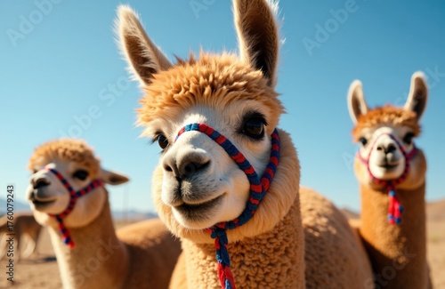 © starush, Obraz premium Colorful llamas with harnesses standing outdoors under a clear blue sky