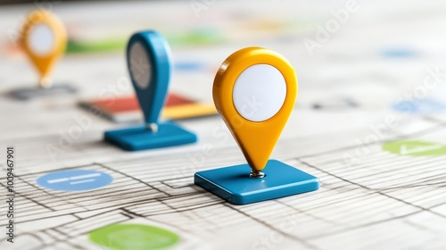 © Nattapun, Fototapeta premium Colorful location pins on a map, white isolate background