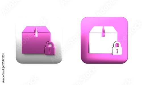 © vector_v, Obraz premium Colorful Locked package icon isolated on white background. Lock and cardboard box. Square button. 3D render illustration