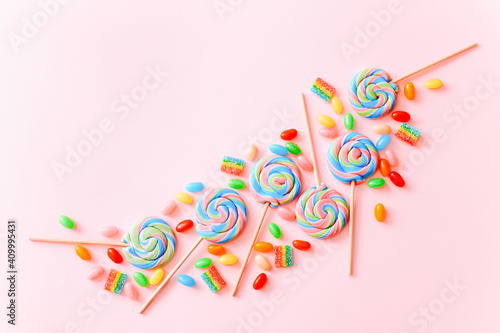 Fototapeta premium Colorful lollipops swirls on sticks. Striped spiral multicolored candy on pink background, top view