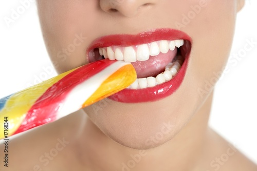 © lunamarina, Fototapeta premium Colorful Lollypop in perfect woman teeth