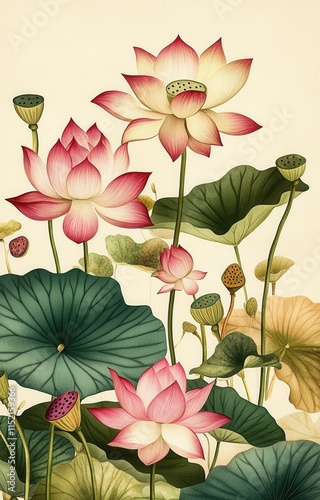 Fototapeta premium Colorful lotus flowers bloom among green leaves in a serene pond setting...