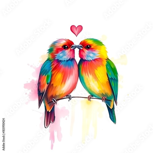 Fototapeta premium Colorful lovebirds kissing with heart above on white background