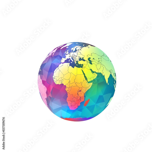 Naklejka premium Colorful low-poly illustration of Earth, showcasing the continents in vibrant geometric patterns against a white background.