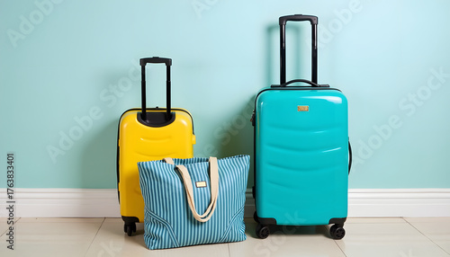 © Yasin, Obraz premium Colorful luggage ready for travel against a light blue wall
