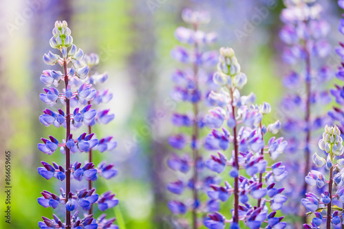 Naklejka premium Colorful lupine flowers on a sunny summer day, close up