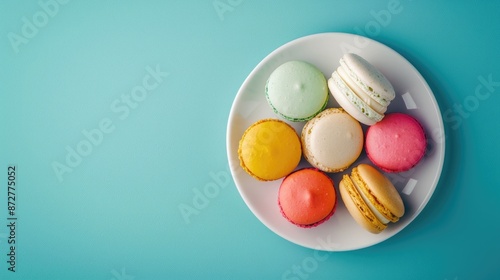 © AkuAku, Obraz premium Colorful macarons on white plate against blue background top view close up