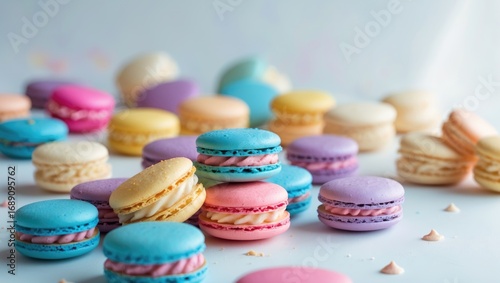 © Sona, Obraz premium Colorful macarons scattered on a light blue surface with a soft pastel background.
