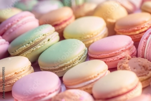 Obraz premium Colorful macaroons on table, generative ai