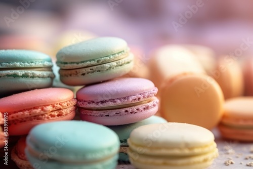 Obraz premium Colorful macaroons on table, generative ai