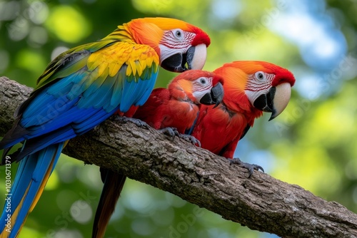 © Thanyarat, Fototapeta premium Colorful macaw family, preening each other on a tree branch