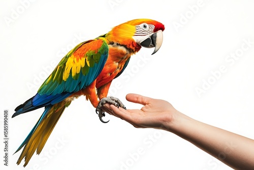 Fototapeta premium Colorful macaw parrot perched on a hand, exotic pet bird with vibrant plumage...