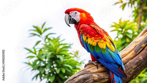 Fototapeta premium Colorful macaw parrot perched on a tree on a white background