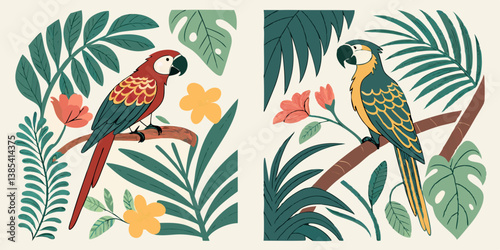 Naklejka premium Colorful Macaw Parrots in Tropical Jungle Vector Art | Flat Design Wildlife Illustration with Exotic Leaves and Flowers