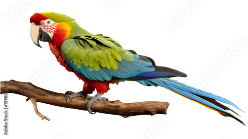 Obraz premium Colorful Macaw Perched: A vibrant macaw, boasting a stunning display of red, green, yellow, and blue feathers, sits gracefully on a branch, capturing the eye with its striking beauty.