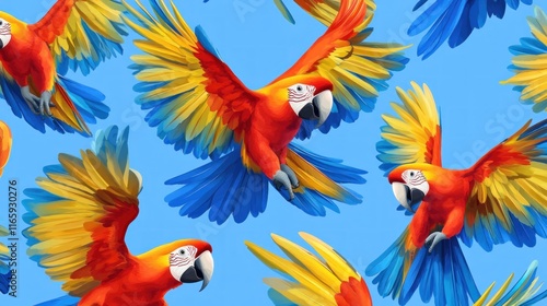 © SlashStd, Obraz premium Colorful macaws in flight against a blue sky.