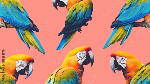 © SlashStd, Obraz premium Colorful Macaws Pattern, Tropical Birds, Pink Background, Fabric Design