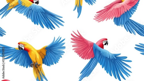 © Photock Agency, Obraz premium Colorful Macaws with Vibrant Wings in Dynamic Flight Against White Background
