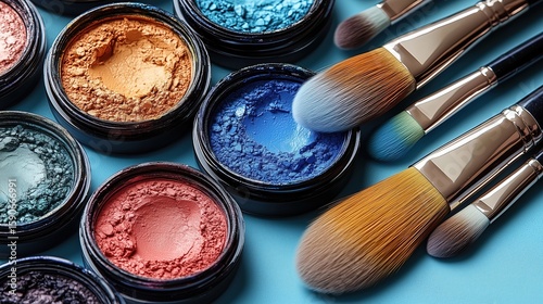 Naklejka premium Colorful Makeup Powder Cases and Brushes Set, for Beauty Tutorials, Product Display, Fashion Beauty Blogs